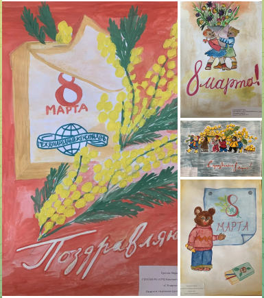К 8 марта наши ребята, под руководством педагогов учреждения создали галерею рисунков по мотивам классических советских открыток.